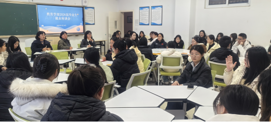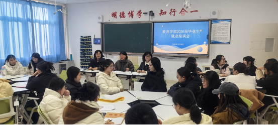 为深入了解2026届毕业生就业现状,精准破解就业困惑,引导学生树立理性就业观,教育学部于3月10日于泽德楼101召开2026届毕业生就业座谈会。学院院长王萍、院长助理翟常秀、学生干事宋爱君和辅导员刘婷婷与毕业生代表齐聚一堂,围绕就业选择、职业规划、家庭期待等核心话题展开深度交流,为毕业生就业之路点亮明灯。