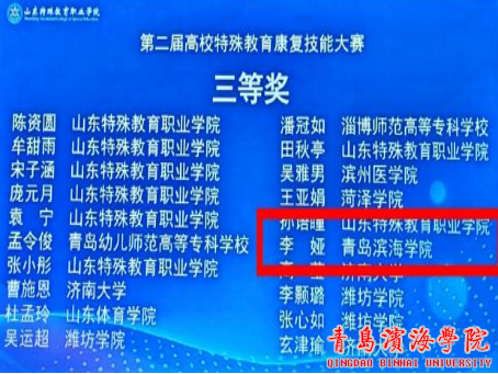 为深化融合教育专业实践教学改革,提升学生特殊教育康复技能水平,11月14日至15日,我院2022级融合教育专业学生李娅、郭梦璐、李一诺、霍昕雨四位同学在专业教师高旭颖的带领下,赴山东特殊教育职业学院参加由山东省残疾人联合会、山东省教育厅、山东省卫生健康委联合主办的第二届高校特殊教育康复技能大赛。